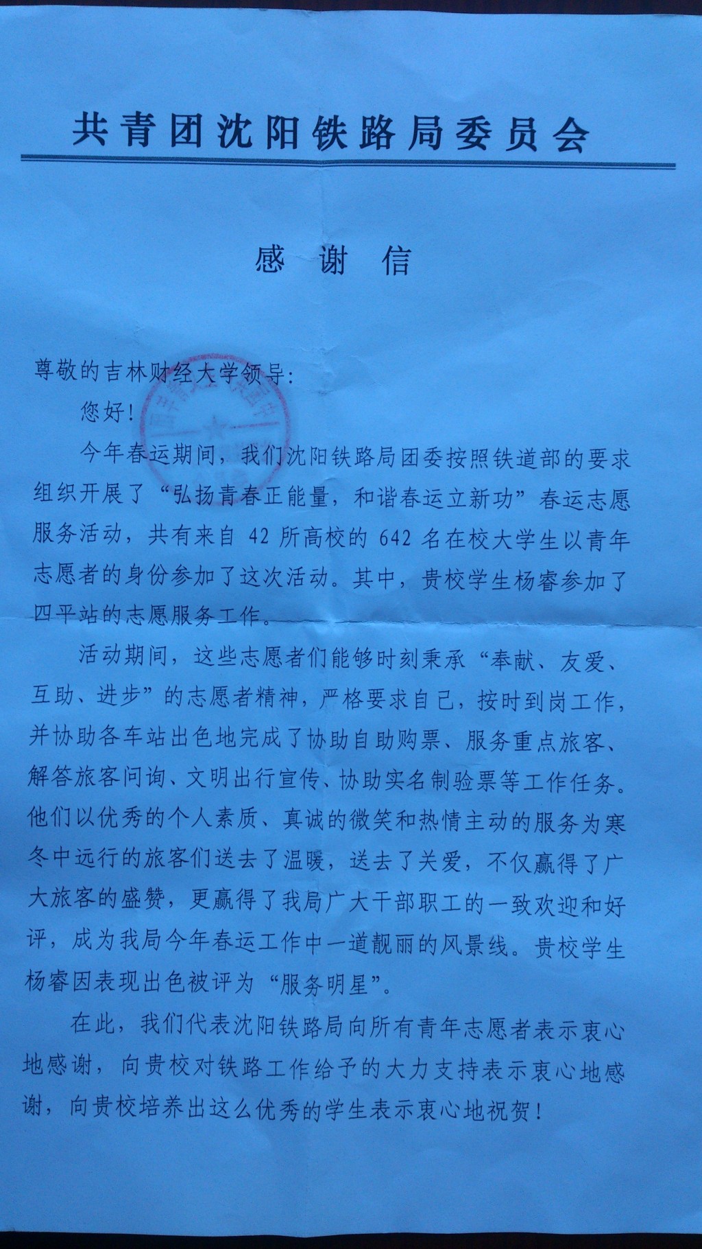 公司会计专业1255班杨睿同学寒假期间义务参加了沈阳铁路局开展的“弘扬青春正能量,和谐春运立新功”春运志愿者服务活动。在活动期间因表现突出,被授予“服务明星”称号。以下是共青团沈阳铁路局委员会为杨睿同学发...