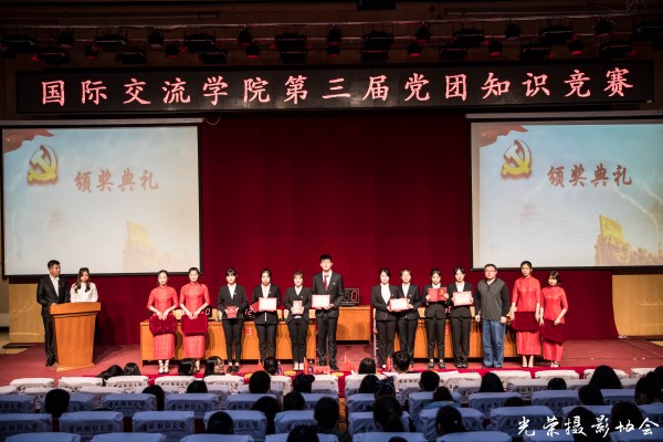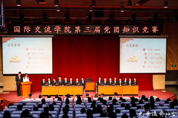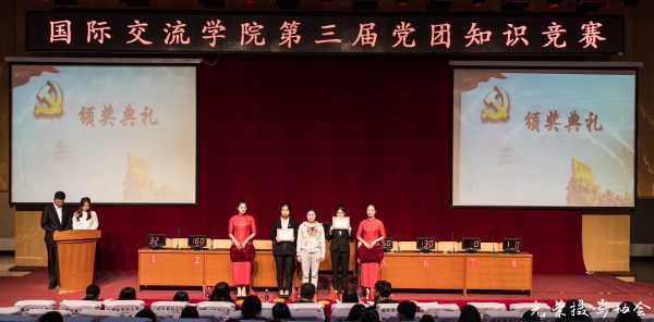 决赛开始,现场一共分为五个环节,分别是第一轮“初露峥嵘”必答题,八组选手轮流回答;第二轮“奋勇争先”抢答题;第三轮“红歌嘹亮”抢答题,根据听到的歌曲猜歌名;第四轮“斗智斗勇”必答题,每位选手自由选择题目类型轮流回答;第五轮“畅所欲言”即兴演讲。每两轮计算一次成绩,每次淘汰两组成员,在最后一轮看视频即兴演讲结束后,按每班最终成绩排名。在活动中,每位同学都竭尽所能为本组争光夺彩,评委老师严格打分。在猜歌环节主持人与全场同学互动,为答对题目的同学送上了小礼品。全场气氛热烈。