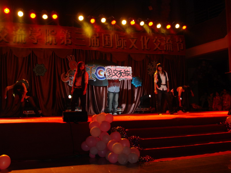 在这五天里礼堂内锣鼓喧天,礼堂外演员精神饱满。为了能够让这些节目更加丰富多彩,我们的同学牺牲自己的课余时间,不厌其烦的排练。员工会成员更是悉心指导,层层筛选,为了不错过每一个精彩,为了让每一个节目更精彩。搭建舞台维持秩序,打扫会场。这些荧光灯旁的美丽笑脸更应该被记录下来。台上一分钟,台下十年功,舞台下准备充分,舞台上自然不在话下。开幕式,一场视觉与听觉的盛宴,将古老的中国之声欧洲中世纪风情现代流行派方方面面的艺术完美的融合与一体。此外我们还得到兄弟院董事长春师范公司及外籍教师的大力支持。第二天饿何尝同样精彩,它通过异国他乡的语言唱出国交的非凡凝聚力和积极向上的精彩风貌。各异的队伍各色的服装我们传递同样的心声,国交是我们共同的家,万水千山有这个家我们永远不孤独,我们是一家人。英文演讲比赛透过一段段精美的文字直射观众心弦,让我们心跳与整个旋律融为一体,让我们的信和语言做一次完美的配音。这里没有赋予变换的灯光,这里没有轰鸣的鼓点,这里一个与舞台不同的舞台,这里只属于心灵的空间。都说艺术源于生活,我们的话剧个个高于生活。