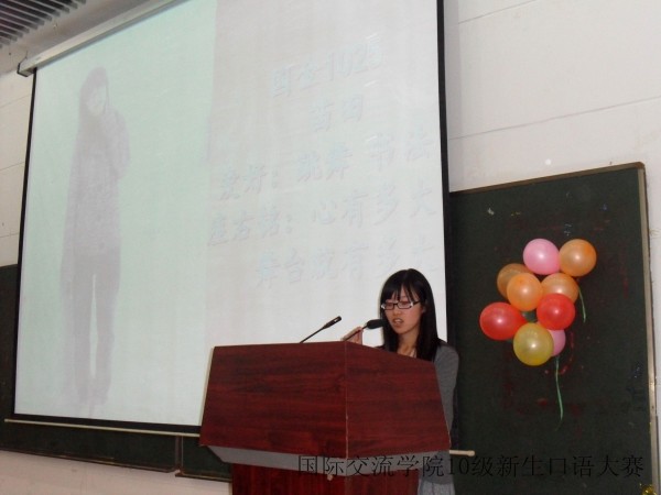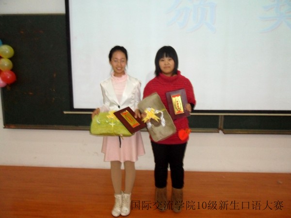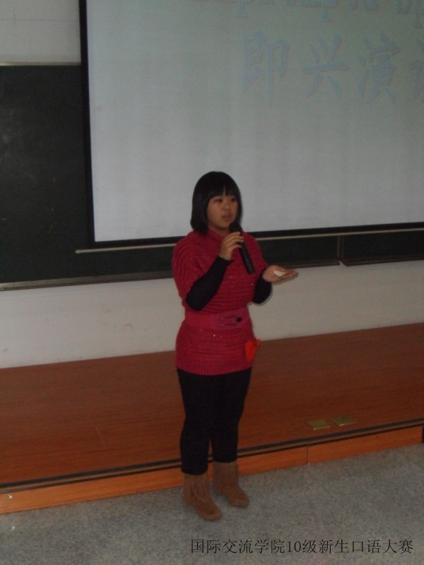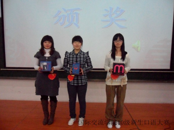 本届新生英语口语大赛经过初赛和复赛仔细甄选了八名优秀的选手。决赛分四个环节进行,第一环节是已备演讲,第二环节是英文才艺展示,第三环节是即席演讲,第四环节是评委提问。各个环节竞争激烈、妙趣横生,尤其是才艺展示的环节给英文演讲增加了更多的乐趣。经过选手的激烈角逐,最后得出了各个奖项:一等奖是国际金融1026班李姝怡,二等奖是国际会计1033班于航和国金1026班沈方圆,三等奖是国际金融1025班苗田、国际金融1027班朱峤雪和国际金融1029班史策,最佳风采奖国际会计1027班张铭川,最佳内容奖国际金融1027班孙鹏。