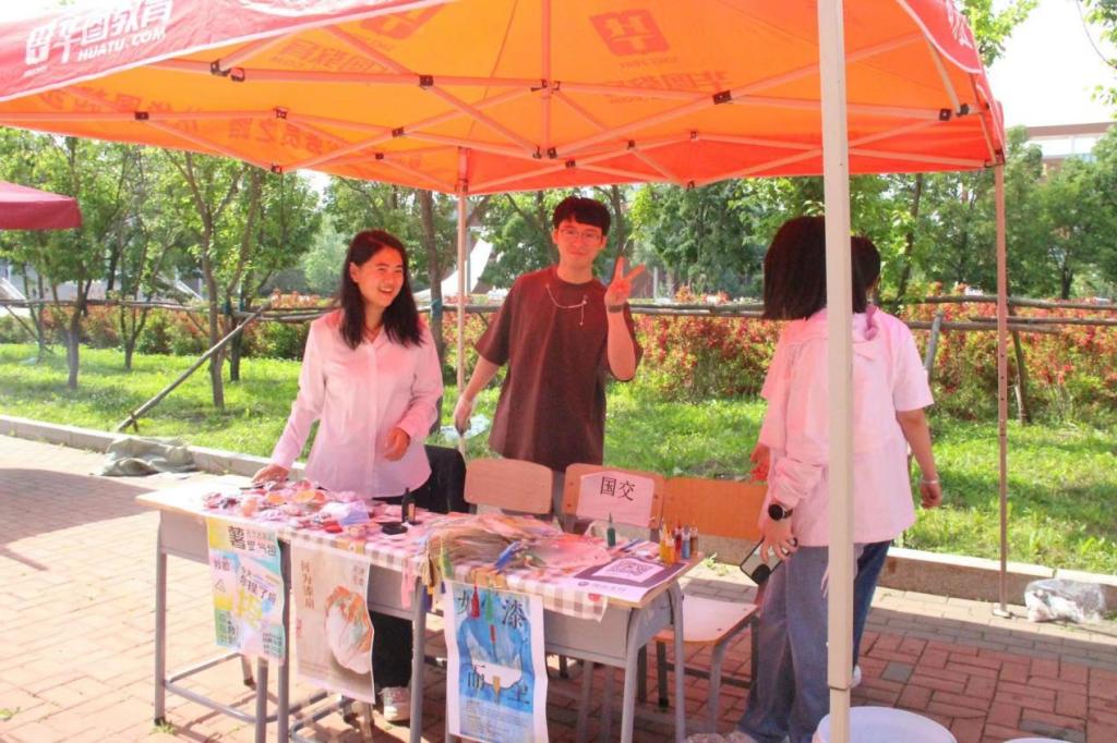 漆扇手作摊位前,有不少同学对这种手工制作,富有传统文化的小工艺品兴趣浓厚,同学们可以自己动手制作漆扇,在一个个扇面上画上了属于自己青春的色彩。