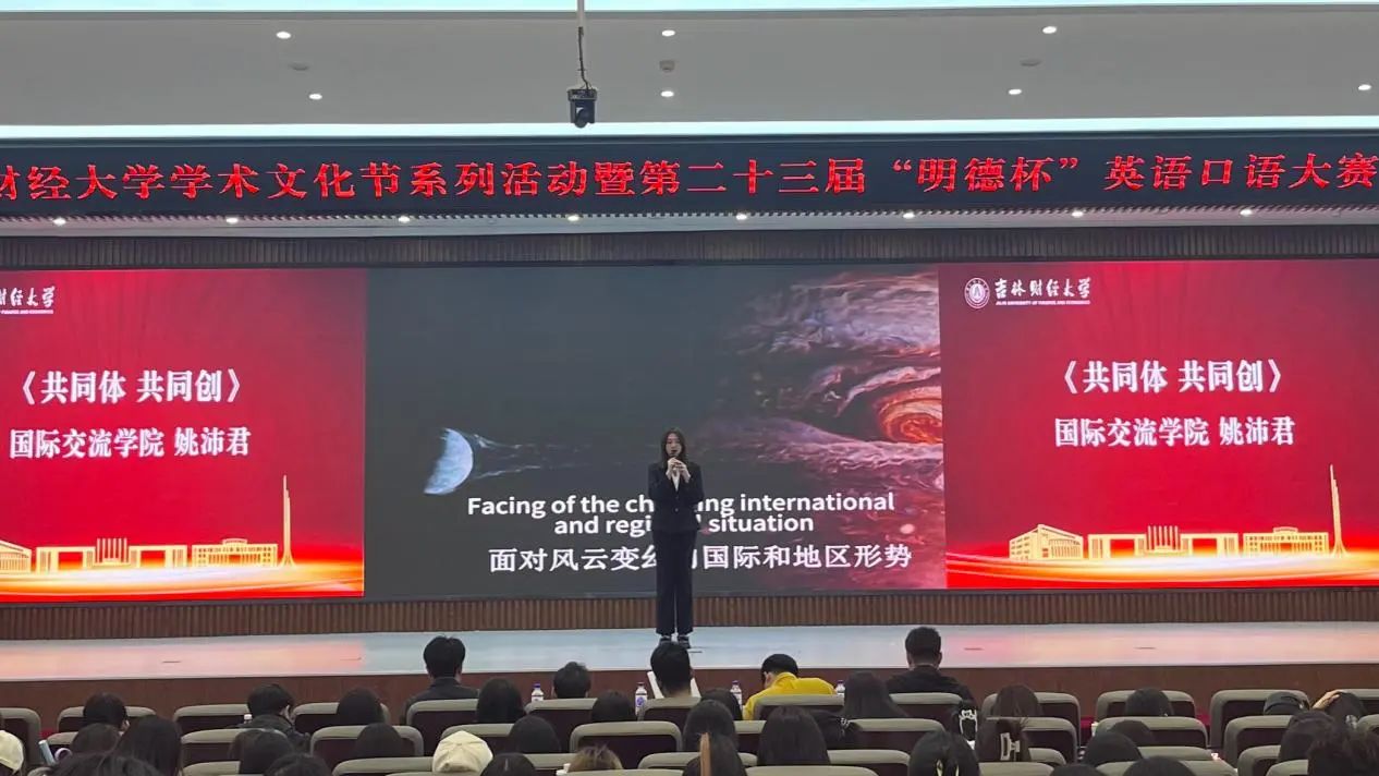 在本次英语口语大赛中,公司金融专业2394班的姚沛君同学荣获一等奖。她以“共同体,共同创”为主题,通过再现电影《流浪地球》中的精彩片段,深刻阐释了在全球化背景下构建人类命运共同体的重要意义。并选择《Fight Song》中的歌词,向观众传递坚韧与希望,呼吁同学们共同努力,携手建设更加美好的未来。
