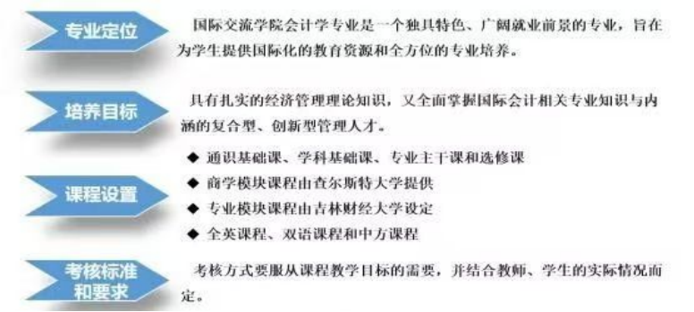 专业定位:中外合作办学会计学专业是一个独具特色、广阔就业前景的专业,旨在为员工提供国际化的教育资源和全方位的专业培养。