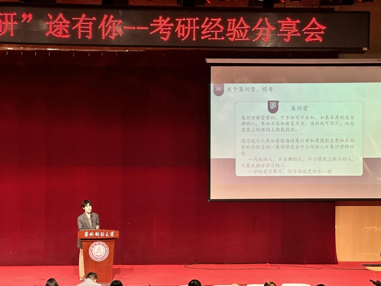 第四位是国交电子商务2023班的宋禹璇学姐,已被录取至西北政法大学审计专业。学姐首先分享了自己的考研成功秘籍,并让大家了解自己目标院校的难易程度、近几年分数线、以及对自己能力的定位等。此外,她还深入分析了各科目备考的技巧,包括英语语法和词汇的重点复习,数学方面的网课推荐,以及在考试中应对难题、巧妙分配时间的策略,为同学们指明明确的学习方向和备考方法。