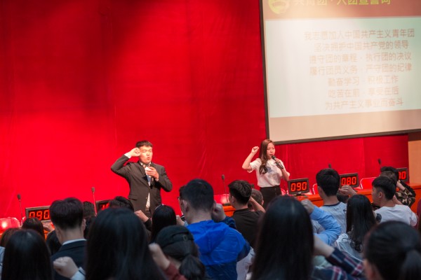 在观看了一段讲述中国共产党发展历程的视频后,全体人员在主持人的带领下举起右手庄严宣誓入团誓词。