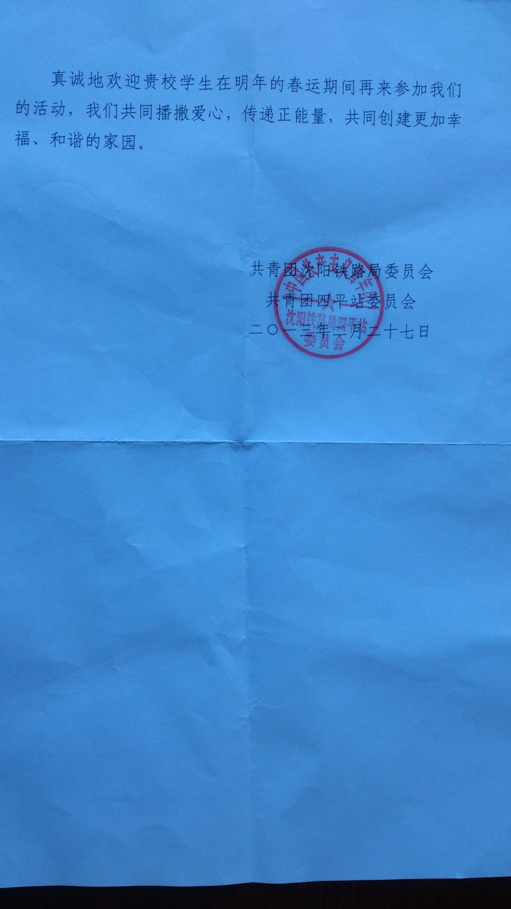 号。以下是共青团沈阳铁路局委员会为杨睿同学发来的感谢信