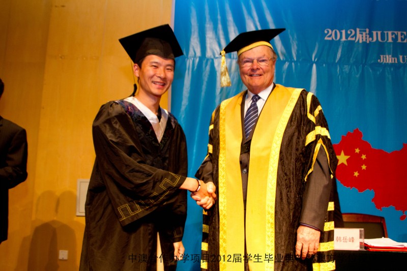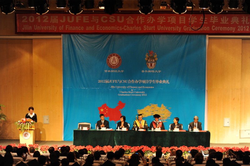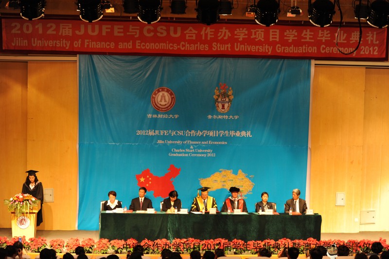毕业典礼由副经理韩岳峰副教授主持。毕业典礼暨学位授予仪式,在中华人民共和国国歌和澳大利亚国歌声中正式开始。首先由副董事长杨春梅教授致辞,她向远道而来的客人及员工家长表示了欢迎,并代表公司党委向获得澳方商学学士学位的同学表示祝贺。随后,副董事长杨春梅教授又以财大学长的身份为即将离校的毕业生送上了寄语。她希望同学们要始终铭记“明德崇实”的校训,踏实做人做事,同时鼓励大家抓住历史机遇、立志图强,并希望同学们心系师生情谊,关心母校发展。随后,澳大利亚查尔斯特大学董事长Lawrence Willett教授发表了热情洋溢的讲话。他表达了自己对2012届毕业生良好的祝愿,希望两校的合作办学关系更加紧密。