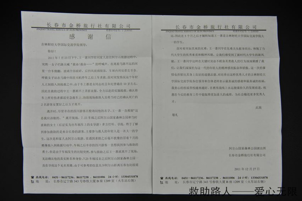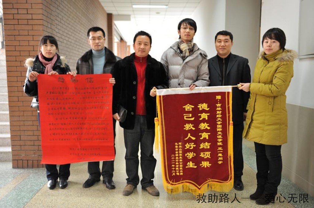王一惠,公司金融专业1031班员工,高中毕业于东北师大附中,现担任公司员工会生活部干事。2011年7月23日,在通往内蒙阿尔山的公路上救助遭遇车祸的四川游客。事后,尽管幸免遇难的游客一再询问王一惠同学的姓名和联系方式,但他都没有留下任何信息,只是说“这是应该做的”就离开了现场。经过阿尔山森林公园派出所、旅游公司和当事人多方寻找,终于在今年12月26日确定了王一惠同学的身份。12月27日阿尔山国家森林公园派出所、长春金桥旅游有限公司和当事的四川籍游客代表来到公司,为王一惠同学送来感谢信和锦旗。