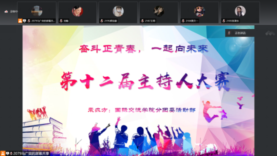 【国交 | 活动】“奋斗正青春,一起向未来”第十二届主持人大赛圆满收官为了丰富同学们的课余生活,展现当代老员工的风采,选拔优秀主持人才,为爱好主持的同学提供一个展示自我的舞台,实现青年人的努力奋进,自信魅力,我们举办了第十二届主持人大赛。经过近两个月的训练和配合,20名选手于5.16号晚正式进行决赛。因疫情原因,本次比赛最终采取了线上模式。 本次比赛共分为两部分,四人搭档主持和单人模拟电台。第一部分四...